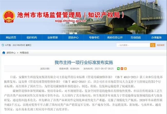 恒生集團始終堅持用標準和創新持續引領行業發展,日前,由恒生集團主持起草的行業標準《管道用碳鋼修補器》(YB/T 4913-2021)獲工業和信息化部批準發布。這是繼《管道用球墨鑄鐵修補器》(YB/T 4652-2018)后,恒生集團主持制定的第2個行業標準,再次填補了國內空白,為管道用碳鋼修補器的設計、制造、檢驗、包裝和運輸提供了權威依據。